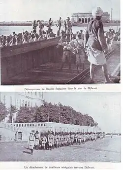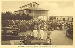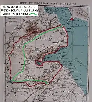 On 18 December 1938, there was a counter-demonstration in Djibouti in the course of which a huge crowd gathered in the centre of town waving the French flag and shouting pro-French slogans.[7] Meanwhile, the Italians built a string of small posts (Abba, Dagguirou, Gouma, etc.) inside the western border of French Somaliland, claiming in late 1939 that the territory had always been part of Ethiopia.[8] In April 1940, they claimed that the French had built a post at Afambo in undisputedly Italian territory, although there is no record that there had been a post there before the Italians built one in October 1940.[9]
