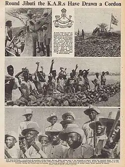 When the policy of stoking a "rally" had no immediate effect, Wavell suggested negotiations with Nouailhetas to obtain use of the port and railway. The suggestion was accepted by the British government but, because of the concessions granted to the Vichy regime in Syria and Lebanon, proposals were made to invade the colony instead.[26] On 8 June, Nouailhetas was given an ultimatum. Wavell promised to lift the blockade and provide one month's worth of provisions if the colony declared for De Gaulle; otherwise the blockade would be tightened. Leaflets were dropped from the air to inform the inhabitants of French Somaliland of the British terms. Nouailhetas wrote to Aden on 15 June about the high rate of infant mortality owing to malnutrition in the territory, but he rejected the British terms.[31] The British considered but ultimately rejected an invasion of French Somaliland because they could not spare the troops and did not wish to offend the local French, whom they hoped would join Free France.[31] The 6th (Tanganyika) Battalion of the King's African Rifles (KAR), composed of troops from the Tanganyika Territory, were at this time deployed along the Zeila–Loyada and Ayesha–Dewele routes.[36]