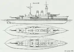 Henri IV was laid down at Cherbourg on 15 July 1897 and launched on 23 August 1899, but did not enter service until September 1903,[1] at a cost of ₣15,660,000 francs.[7] By 1911, Henri IV was assigned as the guard ship of the French naval base in Tunis in French Tunisia.[8] After the Italian destroyer Fulmine stopped and thoroughly searched the French mail steamer Favignano for contraband on 25 January 1912 during the Italo-Turkish War, Henri IV and four French torpedo boats deployed from Bizerte to the southeastern border of Tunisia to stop contraband traffic between Tunisia and the Ottoman Empire and enforce France's obligations as a neutral country.[9]