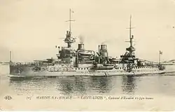 Saint Louis, named after King Louis IX,[6] a Catholic saint, was authorised on 30 September 1895 as one of the three Charlemagne-class battleships. The ship was laid down at the Arsenal de Lorient on 25 March 1895[2] and launched on 2 September 1896.[7] She was commissioned on 1 September 1900[8] after completing her sea trials at the cost of 26,981,000 francs. Even before Saint Louis was formally commissioned, she participated in a naval review conducted by the President of France, Émile Loubet, at Cherbourg in July 1900.[2]