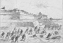 The French army had diverted most of its forces from Vietnam by 1860 to China against the massive Qing army, left only 800 Frenchmen and 100 Spanish facing against 10,000 Vietnamese led by Nguyen Tri Phuong, however, the hesitant Vietnamese made no move against the besieged and outnumbered Franco-Spanish forces. In February 1861, new French reinforcements of 3,500 troops and 70 warships led by General de Vassoigne arrived, broke through the Vietnamese line and captured the Ky Hoa citadel, six kilometers away from Saigon. French forces then took Bien Hoa, My Tho, and Dinh Tuong.[11] Facing the French invasion and internal rebellion, Tự Đức chose to cede three Southern provinces to France in order to deal with the coinciding rebellion. In June 1862, the Treaty of Saigon was signed, resulting in Vietnam losing three rich provinces, Gia Dinh, My Tho, Bien Hoa, and the Poulo Condore Island, and allowing religious freedom along with paying war reparations of 4 million Mexican pesos to France.[12][13][14][15]