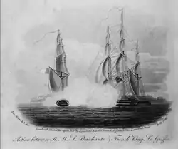 On 11 May 1808 Bacchante captured the French navy brig Griffon off Cape Antonio. Bacchante pursued Griffon for almost seven hours, and fought her for a half an hour, Griffon only struck when she found herself crowded some 100 metres from the breakers with Bacchante only some 200 meters from her. Griffon was armed with fourteen 24-pounder carronades and two 6-pounder guns, and had a crew of 105 men under the command of lieutenant de vaisseau Jacques Gautier. In the engagement Griffon had five men wounded, while Bacchante had suffered no casualties.[22]