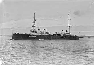 Gloire, named after Glory,[7] was authorized in the 1896 Naval Program and was ordered from the Arsenal de Lorient on 17 September 1898. The ship was laid down on 5 September 1899, launched on 27 June 1900, and completed on 28 April 1904.[8] The cost of her construction was 22,081,725 francs. The ship was assigned as the flagship of Rear Admiral (Contre-amiral) Joseph Bugard, commander of the 1st Cruiser Division (1re Division de croiseurs) of the Northern Squadron. Gloire had been relieved as flagship by 4 August 1905.[9] Together with her sisters Condé and Amiral Aube, Gloire escorted the remains of John Paul Jones from France to Annapolis, Maryland, in April 1906 and then went on to visit New York City.[10] The 2nd Cruiser Division had been formed by January 1907 and Gloire was the division's flagship.[11] On 7–8 August the ship participated in the bombardment of Casablanca, the first step in the French conquest of Morocco.[12] By October 1907 she was the flagship of Rear Admiral Joseph-Alphonse Philibert.[11]