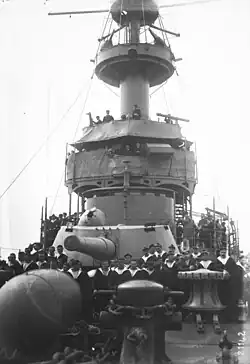 After a reorganization that saw the Mediterranean Squadron redesignated as the 1st Squadron (1re Escadre), Gloire and her sisters Condé and Marseillaise were assigned to the 2nd Light Division (2e Division légère (DL)) of the 1st Squadron by June 1910. As more modern armored cruisers entered service, they were concentrated in the Mediterranean and Gloire (now the divisional flagship), Amiral Aube and Condé were reunited by January 1911 in the Cruiser Division of the 2nd Squadron, as the Northern Squadron had been redesignated.[13] In March the sisters visited New York City.[14] When the Danton-class battleships began entering service in August, the French Navy reorganized yet again with the 2nd Squadron renumbered as the 3rd and the Cruiser Division was renamed as the 3rd DL by 4 September. Gloire was now the flagship of Rear Admiral Charles-Eugène Favereau. The ship participated in the fleet review by the President of France, Armand Fallières, off Toulon that day. While conducting gunnery training on 20 September, a propellant charge exploded prematurely in one of her 194 mm gun turrets that killed nine and badly wounded another five crewmen. A memorial for the dead was conducted aboard the cruiser five days later. After the Agadir Crisis of 1911, the French and British governments agreed in 1912 that the Royal Navy would defend the northern French coast and the French would concentrate their fleet in the Mediterranean and defend British interests there. The French forces left in the north were consolidated into the 2nd Light Squadron with the 3rd DL redesignated as the 1st Cruiser Squadron. The ship was reassigned to the Atlantic Training Division (Division d'instruction de l'Atlantique) by 10 November 1913 where she served as the flagship of Rear Admiral Auguste-Georges Bouxin.[15]