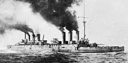 At the outbreak of World War I in August 1914, Waldeck-Rousseau was under repair at Toulon owing to a grounding incident off Golfe-Juan during a hurricane on 22 February.[4][12] Work was completed by 5 September, and by the end of the month she had joined the French fleet blockading the Austro-Hungarian Navy at the southern end of the Adriatic Sea.[13] On 17 October she briefly engaged Austro-Hungarian forces off Cattaro; she fired at the Austro-Hungarian U-boat SM U-4 that had tried to torpedo her and engaged several destroyers that were supported by an airplane before she broke off the action to rejoin the French fleet.[14][15] She was unsuccessfully attacked a second time by an Austro-Hungarian U-boat while on patrol on 4 November.[7] On this occasion, she was patrolling with the cruiser Ernest Renan; Waldeck-Rousseau engaged the submarine and forced it to withdraw.[16]
