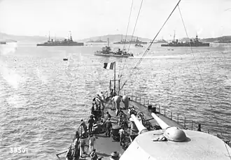 ![]() Fanfare (at the center of the picture), between battleships during an exercise near Toulon in May 1914.