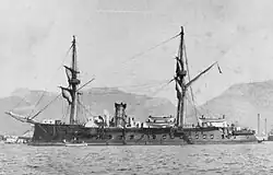 Her main battery consisted of four 240 mm (9.4 in) M1870, 19-caliber guns mounted in individual barbette mounts, two forward placed abreast, and two aft, both of the latter on the centerline. She carried a 194 mm (7.6 in) 19,8-cal. M1870 gun in the bow as a chase gun. These guns were supported by a secondary battery of six 138.6 mm (5.46 in) 21.3-cal. M1870 guns carried in a central battery located amidships in the hull, three guns per broadside. For defense against torpedo boats, she carried twelve 37 mm (1.5 in) 1-pounder Hotchkiss revolver cannon, all in individual mounts. Her armament was rounded out with two 356 mm (14 in) torpedo tubes in above-water launchers forward of the central battery. She also carried a pair of 65 mm (2.6 in) field guns that could be sent ashore with a landing party.[6][5] In 1889, the ship received a pair of 47 mm (1.9 in) guns in place of two of the 37 mm guns, and by 1893, a further four of the 47 mm guns were added.[5]