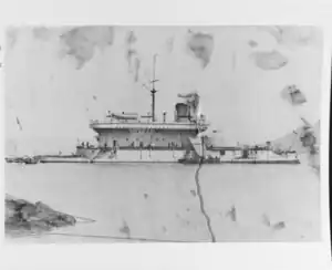 Vengeur was originally designed to be primarily armed with a ram, but the addition of turret-mounted guns offered greater capability with increased complexity and cost.[8][9] As built, the ship carried a main battery of two 340 mm (13.4 in) 18 calibre Modèle 1875 guns in a single twin turret with a secondary armament of four 100 mm (3.9 in) guns. In 1900, the latter was replaced by six single 47 mm (1.9 in) guns and six single 37 mm (1.5 in) guns, positioned on the hurricane deck. The ship was also equipped with three 60 cm (24 in) searchlights.[1]