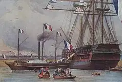The Normandie built in 1835, was a French paddle steamer working in conjunction with her sister ship the Seine (1836) on the lower reaches of the Seine.[1] The route she serviced was between Le Havre and Rouen via Honfleur with secondary stops along the way. She gained fame by being a participant in the retour des cendres ("return of the ashes") of Napoleon to France.