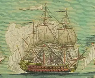 HMS Warspite under Admiral Boscawen captured Téméraire at the Battle of Lagos on 18 August 1759. She was thus taken into the Royal Navy and recommissioned as the Third Rate HMS Temeraire.[1]