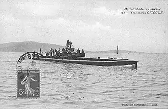 Cigogne was the second of two Aigrette-class submarines built for the French Navy between 1903 and 1905. Laid down in May 1902, she was launched in November 1904 and commissioned in July 1906. She was an essentially experimental submarine, and although in service during World War I, saw no action. The class was designed by Maxime Laubeuf and used Drzewiecki drop collar launchers and external cradles to launch torpedoes.