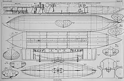 The submarine used a compressed-air engine, propelled by stored compressed air powering a reciprocating engine.[3] The air was contained in 23 tanks holding air at 12.5 bar (1.25 MPa, 180 psi), taking up a huge amount of space (153 m³/5,403 ft³), and requiring the submarine to be of unprecedented size. The engine had a power of 60 kW (80 hp), and could propel the submarine for 5 nmi (9 km), at a speed of 4 kn (7.2 km/h).