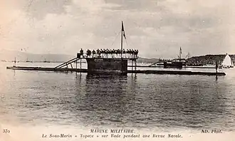 The boats were armed with four internal 450-millimeter (17.7 in) torpedo tubes, two in the bow and two in the stern, for which they carried six torpedoes.[4] Topaze and her sister Turquoise were the first French submarines to be equipped with a deck gun when they were fitted with a single 37-millimeter (1.5 in) gun in August 1915.[1]