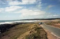 The water at Freshwater West is part of the Pembrokeshire Marine SAC, and it also forms part of the Angle Peninsula Coast SSSI. It is situated within Pembrokeshire Coast National Park. There are strong currents from the northwest and southeast, while the beach has a tidal range of 6.5 metres (21 ft).[3] At almost a mile long, Freshwater West is flanked by extensive sand dunes and rock pools. The land in the area consists of dunes with fens, grassland, reedbeds, purple moor grass, rush pastures, and maritime cliffs, and is inhabited by wildlife such as waders, chough, overwintering northern lapwing, and grey seal.[3] Despite its natural beauty, Freshwater West is unsuitable for bathing due to strong offshore swells and strong currents.[5] There is an abundance of fossils in the area, and in 1921 some 50 were reported to have been discovered here.[6]