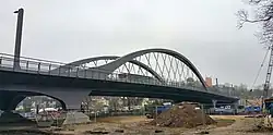 The construction of the new bridge involved pre-assembly at the southern port of Spandau and transportation to its destination via pontoons on the Havel River after the demolition of the old bridge.[24] In September 2015, the components for the pre-bridge arrived by truck, as delivery by ship was not possible due to low water levels.[35] The pre-bridge was assembled on site from October 10, 2015.[36] The arches that linked the riverbanks were reconnected to the banks on April 16, 2016.[37] Another crucial step occurred on June 3, 2016, when the 400-ton center section, known as the Stromfeld,[38] was transported from the upper harbor of the southern harbor north of the Schulenburgbrücke to the Freybrücke and then lifted into place.[39] On June 4, welding began to anchor the lifted center section of the bridge. On both days, the Havel was closed to traffic in this section. Initially, traffic clearance was targeted for November 1, 2016,[40][41] but weather conditions prevented the final asphalt and marking work.[42]