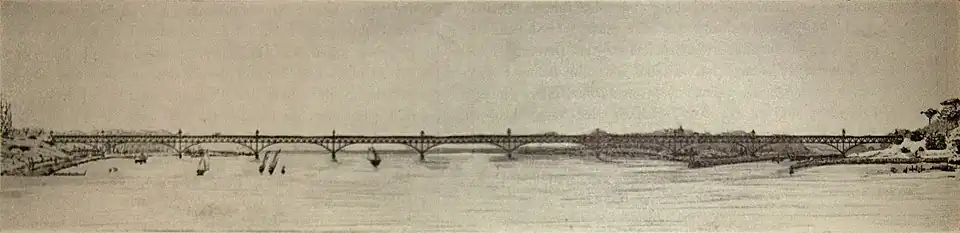 "If there is a question of the connection of floor girders above the carriageway of the central opening with girders lying below the carriageway, here there are five openings in such a way that on both sides of the floor girders of the central main opening, there are two side openings each with corresponding girders. The wide-span arches of the central opening alone project above the roadway, while the main girders of all four side openings lie below the roadway, giving the entire bridge appearance a characteristic emphasizing the river opening."
