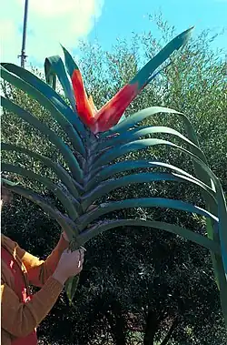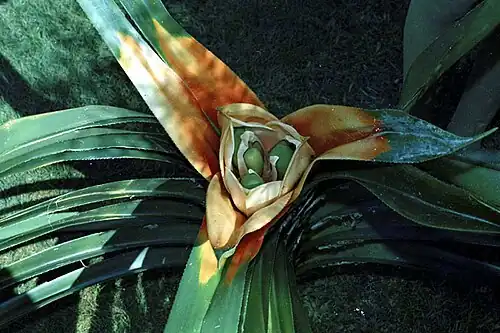 Freycinetia marginata is an evergreen root climber with a stem diameter of up to 3 cm (1.2 in), which is held tightly to its support substrate by numerous adventitious roots.[4][5] The leaves have fine longitudinal veins and are green with a purplish hue. They are long and strap like, measuring up to 150 cm (59 in) long by 8 cm (3.1 in) wide, and the margins (edges) may have small spines or teeth.[4][5] The leaf bases are expanded laterally to form ligules, that is, thin membranous extensions of the leaf blade which overlap with neighbouring ligules, creating traps for water and biotic debris.[4]