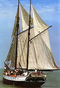 Fri was built for sail alone; she is a Baltic coastal trader constructed out of oak in 1912 in Svendborg, Denmark. She is 32 meters (105') long with a gaff rig, hand winches, and traditional ropes and canvas sails.[5] In 1969 she carried 60 tons of cargo on an historic passage between Northern Europe and San Francisco. In 1970 she carried fresh water to the American Indian activists who had seized and occupied Alcatraz Island from the U.S. government. In 1971 under her new owners American David Moodie and his brothers, the Fri sailed from Hawaii to New Zealand crewed by a group of hippie consumer escapes, in search of adventure and an alternative lifestyle down-under. This epic voyage to New Zealand would result in the vessel and its owners carving their name in New Zealand peace history.[1][5][6]