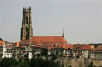 Fribourg Cathedral (French: Cathédrale Saint-Nicolas de Fribourg) is a Roman Catholic cathedral in Fribourg, Switzerland, built in the Gothic style, on a rocky outcrop 50 metres above the river Sarine (Saane), dominating the medieval town below. It is the episcopal seat of the Diocese of Lausanne, Geneva and Fribourg.