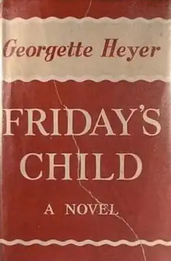 Friday's Child is a novel written by Georgette Heyer in 1944. It is generally considered one of Heyer's best Regency romances, and was reportedly the favourite of the author herself.[1] Heyer retained only a single fan letter, which was from a Romanian political prisoner who kept herself and her fellow prisoners sane for twelve years by telling and retelling the plot of Friday's Child.[1]
