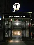 Fridhemsplan metro station is a station of the Stockholm metro, located in the district of Kungsholmen. The station is entirely underground and provides an interchange between the Blue and Green lines. There are two platforms for each line, about a hundred metres apart.
