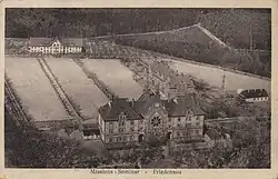 Within the next ten years, a collection of large school buildings and living quarters emerged on the campus that still stand today and are local landmarks synonymous with Friedensau. Based on a holistic pedagogic concept, a sanatorium, workshops and a health-food factory were added, providing opportunities for both practical work experience and income for the pupils at the same time. In this way, Friedensau grew quickly to become a Missions and Industrial School which was visited by up to 250 pupils each year until the First World War.[9]