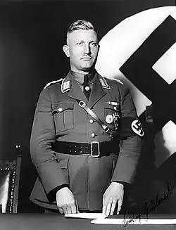 Briefly suspended as Gauleiter by Rudolf Hess in July 1930 for criticism of Adolf Hitler's alliance with industry, Hildebrandt was reinstated on 31 January 1931 after making a declaration of loyalty to Hitler.[4] He was elected to the Reichstag in September 1930 as a deputy for electoral constituency 35 (Mecklenburg) and retained that seat until the fall of the Nazi regime. After the Nazi seizure of power, he was named Reichskommissar for the Free States of both Mecklenburg-Schwerin and Mecklenburg-Strelitz on 24 March 1933. He was subsequently elevated to the new post of Reichsstatthalter (Reich Governor) of Mecklenburg-Schwerin, Mecklenburg-Strelitz and the Free City of Lübeck on 26 May 1933. He thus united under his control the highest party and governmental offices in his jurisdictions. On 1 January 1934, the two Free States were combined into a unified Mecklenburg. From 1933 to 1934, Hildebrandt also served as the leader of the Nordische Gesellschaft (Nordic Society), which sought to strengthen German-Nordic cultural and political cooperation. He was also made a member of Hans Frank's Academy for German Law in 1935. On 1 April 1937, the Greater Hamburg Act transferred the City of Lübeck to Gau Schleswig-Holstein and Hildebrandt's Gau was renamed Gau Mecklenburg.[5]