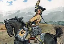 Friedrich Wilhelm Freiherr von Seydlitz[Note 1] (3 February 1721 – 8 November 1773[1]) was a Prussian officer, lieutenant general, and among the greatest of the Prussian cavalry generals. He commanded one of the first Hussar squadrons of Frederick the Great's army and is credited with the development of the Prussian cavalry to its efficient level of performance in the Seven Years' War. His cavalryman father retired and then died while Seydlitz was still young. Subsequently, he was mentored by Margrave Frederick William of Brandenburg-Schwedt. Seydlitz's superb horsemanship and his recklessness combined to make him a stand-out subaltern, and he emerged as a redoubtable Rittmeister (cavalry captain) in the War of Austrian Succession (1740–1748) during the First and Second Silesian wars.