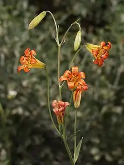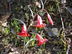 Fritillaria recurva, the scarlet fritillary, is a North American bulb-forming herbaceous perennial plant in the lily family Liliaceae.[2][3] It is native to the western United States, from southwest Oregon down to northern California where it grows in the Klamath Mountains, Northern Coast Ranges, Cascade Range, and Sierra Nevada. Most of the known Californian locations are in the northern half of the state, as far south as Solano and El Dorado Counties, but there are isolated populations in Tulare and Mariposa Counties.[4] The species has also been reported from Douglas and Washoe Counties in Nevada.[5][6] It grows in dry, open woodlands and chaparral at 300–2,200 metres (980–7,220 ft), and it blooms in spring from February to July.[2]