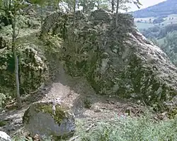 The main castle was formed by a housing tract and a curtain wall. The wall follows the irregularly extending ledge. The massive living area consists of two parts and a smaller west building with irregular floor plan as a residential tower. The thick walls were up to 3 meters (9.8 ft) thick and built from rough cut stone. To the east, adjoining the living area, is an elongated building that served as an administrative and residential building. On the northwest and northeast sides the remains of outlying estates are visible.