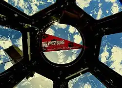 Image of Earth and a Frostburg State University pennant taken from the International Space Station by FSU Alumni and NASA Astronaut Richard Arnold.