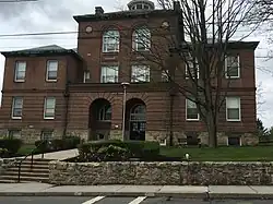 The State Board of Education selected and the town of Frostburg paid for the two-acre Beall Park[14] as the location of the new school on August 9, 1898.[15] The cornerstone was laid in a ceremony on September 4, 1899.[16] The Normal School's first building, Old Main, was positioned in Beall Park to face Loo Street (now known as College Avenue) and to look down Wood Street toward the downtown area of Frostburg.[17] State Normal School No. 2, the first institution being located in Baltimore and then Towson, opened with its first class on September 15, 1902, with 57 students with Frostburg's first administrator, Principal Dr. Edward D. Murdaugh (November 18, 1853 - May 1925).[18][19][20] In 1904, eight students became the first graduates of the college, receiving a diploma and a lifetime teaching certificate.[18][21] In 1912, a new gymnasium was authorized and completed in 1914.[18] In 1919, a dormitory was opened.[18] In 1925, a second dormitory was opened.[18] In 1927, Allegany Hall, a new auditorium, gymnasium, and heating plant was added.[18] In 1930, a six-room practice elementary school known as the new laboratory school[17] was opened and the campus was extended to 40 acres, taking over the Brownsville area of Frostburg.[18]