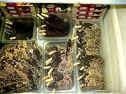Frozen bananas are desserts made by placing a banana upon a stick, freezing it, and usually dipping it in melted chocolate or yogurt. They may be covered with toppings such as dried fruit, chopped nuts, chocolate chips, sprinkles, sugar and crushed cookies.
