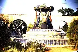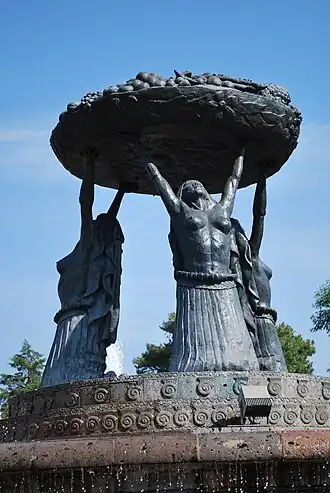 The original fountain was installed next to the city's aqueduct in October 1931 and featured a colorful concrete sculpture. It was a work by Antonio Silva Díaz and Benigno Lara. It featured three bare-chested kneeling women holding a basket of fruits. They wore blue rebozos on their heads and skirts of the same color.[2] The meaning of the work was never explained and they never received an official name. Citizens commonly referred to them as "Fuente de las Indias" (Indians Fountain), but the government later promoted them as the "Fuente de las Tarascas" (Tarascans Fountain) after the Indigenous group found in the state of Michoacán. The sculptures received criticism for being naked. On 25 August 1965, the sculptures were removed and were transported to the offices of the State Treasury, 800 m (2,600 ft) away from their original location. They were removed as the municipal president, Fernando Ochoa Ponce, considered them to be out of harmony with the area and lacked any value or meaning. They were replaced by a fountain named El Huarache by Ángel Díaz. Since 1967, the original sculpture is located at Expo Feria Morelia. At some point, the fair changed its location and the sculpture was moved to the new site. However, the fruit bowl was permanently damaged. It was replaced with a smaller version.[3][4][5]