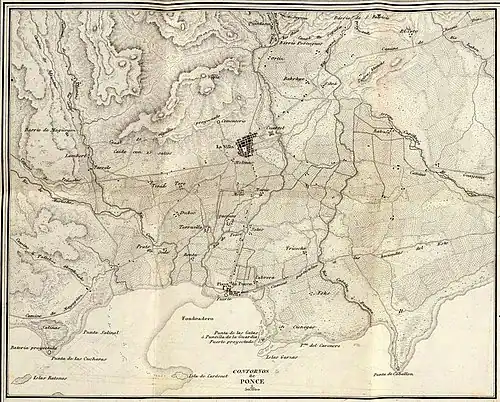- ^ a b Claudio Coello. Contornos de Ponce. 1850. Atlas de España. (See: Anibal Sepúlveda Rivera. Puerto Rico Urbano: Atlas Histórico de la Ciudad Puertorriqueña. San Juan, PR: Carimar, and Puerto Rico's Departamento de Transportación y Obras Publicas. 2004. Volumen 2 [de 4]: La Domesticación del Territorio. p.137. ISBN 0963342347