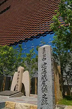 Fukuzawa Yukichi's childhood home in the Rusui-cho neighbourhood of the city of Nakatsu in Ōita Prefecture still exists. It is located on the lower reaches of the Nakatsu River, almost due east of Nakatsu Castle (33°36′26″N 131°11′27″E / 33.60722°N 131.19083°E). Fukuzawa Yukichi was born in 1835 in the Nakatsu Domain warehouse in Osaka and the family returned to Nakatsu after his father's death when he was 18 months old. He lived in this house in Nakatsu until age 19. The structure is a typical samurai residence of the late Edo Period and is a one-story wooden, thatch roof building with two 6-tatami, one 8-tatami, and one 4.5 tatami rooms. The north of the main building is a two-story kura storehouse with a tile roof. In 1971 this former residence and the ruins of a former residence across the street were designated as a National Historic Site.[9][10] The house and the adjacent Fukuzawa Yukichi Memorial Hall, which displays the original manuscript of Gakaku no Susume and Fukuzawa Yukichi's personal belongings, are the major tourist attractions of this city.[11] It is located approximately a 15-minute walk from Nakatsu Station on the JR Kyushu Nippō Main Line.