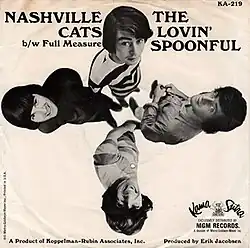"Nashville Cats" was released as psychedelic music began to reach its height in popularity, and the song stood in contrast to the music being recorded by the Spoonful's peers.[13] As a hedge, Kama Sutra Records opted to include a song more suggestive of psychedelia,[15] "Full Measure", as the single's B-side.[8] Both the band and their record label were cynical of the possibility of "Nashville Cats" succeeding in the pop charts,[8] but the band remained hopeful it could become a crossover hit in the country music market.[11] MGM Records mailed the song to country radio stations across the US on a promotional EP, the liner notes of which were partly written by the country musician Buck Owens.[16][17]