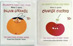 Original packages for the two Funny Face flavors deemed offensive and soon replaced. "Injun" was a slang alteration of "Indian" (in reference to Native Americans), extant from the 17th into the 20th centuries, and now considered racist.[3] "Chinese Cherry" displays the exaggerated epicanthic fold and buck teeth typical of stereotypes of East Asians in the United States, extant in the 20th and into the 21st centuries,[4] particularly seen in American World War Two anti-Japanese propaganda,[5][6] and now considered racist as well.[4]