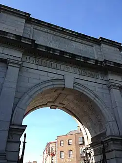 The construction of the arch coincided with a time of political and social change in Ireland, and the colonial and imperial background to the dedication were anathema to a burgeoning nationalist movement – who labelled the structure "Traitor's Gate".[10][11][12] Though damaged in a cross-fire between the Irish Citizen Army and British forces during the 1916 Easter Rising,[9][13] the arch remains "one of the few colonialist monuments in Dublin not blown up" in Ireland's post-independence history.[10][12]