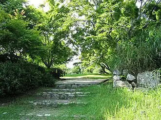 The inner bailey of Tobayama Castle is a 100-meter-square space surrounded by stone walls with a masugata (composite gate) guarded by large stones.