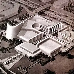 Futurama was an exhibit and ride at the 1939 New York World's Fair designed by Norman Bel Geddes, which presented a possible model of the world 20 years into the future (1959–1960). The installation was sponsored by the General Motors Corporation and was characterized by automated highways and vast suburbs.[5]
