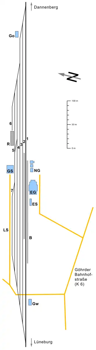 The station has an imposing station building on the southern side of the tracks which is accessed via a cobbled approach road from Göhrde's station road (Kreisstraße 6). The goods facilities are mostly to be found north of the tracks and there are two signal boxes: one at the western and one at the eastern approach to the station. The entire station and its approach has been placed under protection.[11]