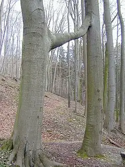 The bedrock of the Göttingen Forest area is mainly made up of layers of middle Triassic Muschelkalk. In the incisions made by the Lutter and Braten valleys there are deposits from the Pleistocene and Holocene epochs. The largest and highest-lying part of the forest, namely the plateau-like areas of the northern Plessforst from the Hünstollen to Plesse Castle and the eastern part from the Lengderburg in the south via the Mackenröder Spitze to the Södderich, are characterised by layers of Lower Muschelkalk, whilst Trochitenkalk and Ceratite layers of the Upper Muschelkalk are the predominant formations found in the central and western part of the forest that has undergone greater movement. Middle Muschelkalk is found in the transition areas. In the Lange Nacht region and the adjacent slopes of the Kleper there is an elongated trough of upper Triassic Keuper, and individual pockets of the Lower Keuper are also found in the southern part of the Göttingen Forest. To the north, east and south, regions of sandstone border on the forest. In the west there are Pleistocene silts and finally the Holocene water meadow loam of the Leine valley.[3] Many old quarries are located in the Trochitenkalk and Lower Muschelkalk in which limestone, the main building material for nearby settlements, was obtained. By contrast, the more thinly bedded and very brittle layers were just used as hard core for road building or to reinforce dirt tracks. The limestone areas of the Lower and Upper Muschelkalk are mostly covered with just a thin layer of humus which, even when weathered, do not support very fertile agricultural soils. Settlements were therefore established almost entirely in the areas where Middle Muschelkalk occurs which is also where several small springs rise.[1]