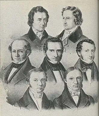 The Göttingen Seven (German: Göttinger Sieben) were a group of seven liberal professors at University of Göttingen.[2] In 1837, they protested against the annulment of the constitution of the Kingdom of Hanover by its new ruler, King Ernest Augustus, and refused to swear an oath to the king.[3][4] The company of seven was led by historian Friedrich Christoph Dahlmann,[5] who himself was one of the key advocates of the previous constitution. The other six were the Germanist brothers Wilhelm and Jacob Grimm, famed collectors and publishers of folklore, known collectively as the Brothers Grimm;[6] jurist Wilhelm Eduard Albrecht; historian Georg Gottfried Gervinus; physicist Wilhelm Eduard Weber; and theologian and orientalist Heinrich Georg August Ewald.[1]
