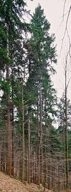 The tallest tree in Germany is in Mühlwald, a part of the Arboretum Freiburg-Günterstal,[12] a Douglas fir with a trunk circumference of 300 cm at the base, and a height of around 65 metres.[13] It was given the name Waldtraut vom Mühlwald 47°57′12″N 7°51′40″E / 47.953365°N 7.861127°E. In August 2008, the Eberdach Douglas fir was relegated to second place. The measurements of both trees were taken by a measurement team from the Geodetic Institute of the University of Karlsruhe. The measurement in March 2017, commissioned by the municipal forestry office, resulted in a height of 66.581 m.[14] The measurement from 19 November 2019 resulted in 67.18 m.[15]