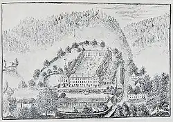 The company Friedrich Mez & Co., established on 1 June 1812, bought the principal conventual building along with the ancillary buildings and land on 5 September 1812 for 8,000 Gulden.[8] They constructed a cotton mill, which had to be auctioned off soon after, in 1817. The new owners, Benedict and Marquard von Hermann, then hired mainly children from the ages of 12-14 to work at the mill. In the night of 3–4 April 1829, the mill was burnt almost completely to the ground, among rumours of arson, perhaps even by the owner himself.[9] A reward was offered for any information relating to the crime.[10][11][12]