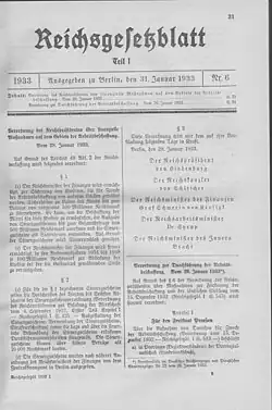 Promulgation of the ordinance authorizing 500 million ℛ︁ℳ︁ to finance Gereke's employment creation plan, published in the Reichsgesetzblatt of 31 January 1933