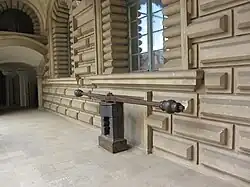 Güstrow Palace is quadrangular in shape. Some of the old furniture has been removed to Schwerin and other places following the death of Magdalena Sybilla which marked the end of the Güstrow lineage. In one part of the palace, there are well preserved Flemish paintings; one particular painting is of a Dutchman smoking. A theatre is in good shape with well preserved original stucco paintings. The stucco ceilings are retained in their original form in the palace. The banquet hall's ceiling has unique stucco paintings of hunting scenes which are adaptations from Dutch copper engravings.[2] The medieval rooms in the basement of the palace, which are vaulted, have many artifacts of the medieval period of Germany. The art chamber contains exhibits of hunting and ceremonial weapons. The refurbished former dining halls, residential and reception rooms have exhibits of paintings of Cranach, Marten de Vos, and Tintoretto. Antique ceramic vessels and a large number of glass items are on display in the former chamber of the duchess. There are also displays from the 19th to 21st centuries.[2]