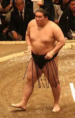 Gōeidō Gōtarō (豪栄道 豪太郎; born April 6, 1986 as Gōtarō Sawai (澤井 豪太郎, Sawai Gōtarō)) is a former sumo wrestler from Osaka Prefecture, Japan. He made his professional debut in January 2005 and reached the top makuuchi division in September 2007. Long regarded as one of the most promising Japanese wrestlers in sumo,[1] Gōeidō holds the modern record for the most consecutive appearances at sumo's third highest rank of sekiwake, at 14 tournaments. He was finally promoted to the rank of ōzeki following the July 2014 tournament,[2] after scores of twelve wins against three losses in two of the previous three tournaments. However, he only managed to win ten or more bouts in a tournament as an ōzeki on six occasions, and was kadoban, or in danger of demotion, eight times. He won his only top division tournament in September 2016 with a perfect 15–0 record[3] and was a runner-up seven times in his career. He retired in January 2020 after two consecutive losing records that would have seen him demoted, to become an elder of the Japan Sumo Association under the name of Takekuma.