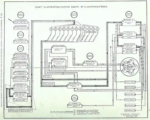 Unless the practice of machine design is followed and all the parts of the plan or scheme and their various interrelationships are clearly shown on paper it is practically impossible to determine where the routine employed involves duplication of authority and effort and working at cross-purposes, where methods of check are defective or overlap and where essential requirements are overlooked and non-essentials introduced. Due to the absence of such diagrams, the conception in the mind of the average shop or office employee of the methods employed in the operation of a business outside of his own immediate duties is little more than a blur and this applies to the ordinary routine work of an office, to the methods of accounting employed and to the system of controlling the progress of work throughout the shops. It would be difficult to overestimate the educational value of a series of diagrams illustrating all of the routine of the business rendering it possible for every member of the organization to obtain an intelligent conception of the business as a whole and of the relationship of his particular work to the general plan.[10]